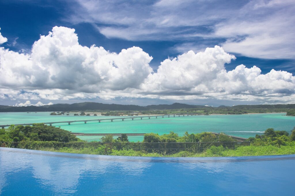 こんな感じで見渡せちゃいます。ここはホテルの通り道にあった開けたところからの写真です。古宇利大橋とエメラルドグリーンの海がすばらしい。